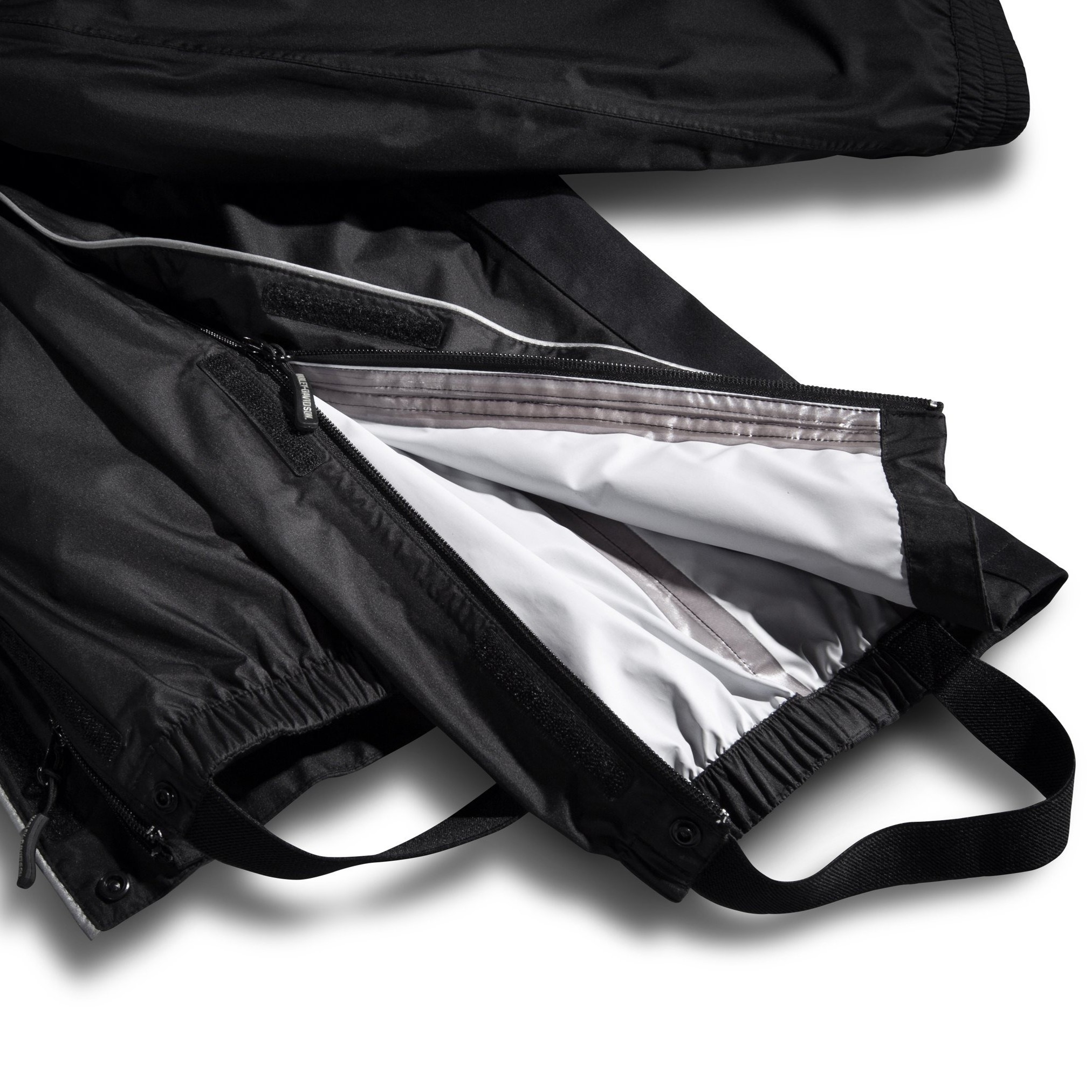 - Additional Features: Two-way zipper front. Bungee cord and toggle hood folds under collar. Leg side zipper to knee. Heat-resistant shields on lower inner legs. 3M Scotchlite reflective material piping, stripes, and graphics