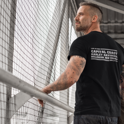- Capital Coast Harley-Davidson back print, colours will vary to match the colour of the tee