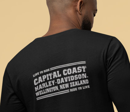 • Capital Coast Harley-Davidson back print, colours will vary to match the colour of the tee