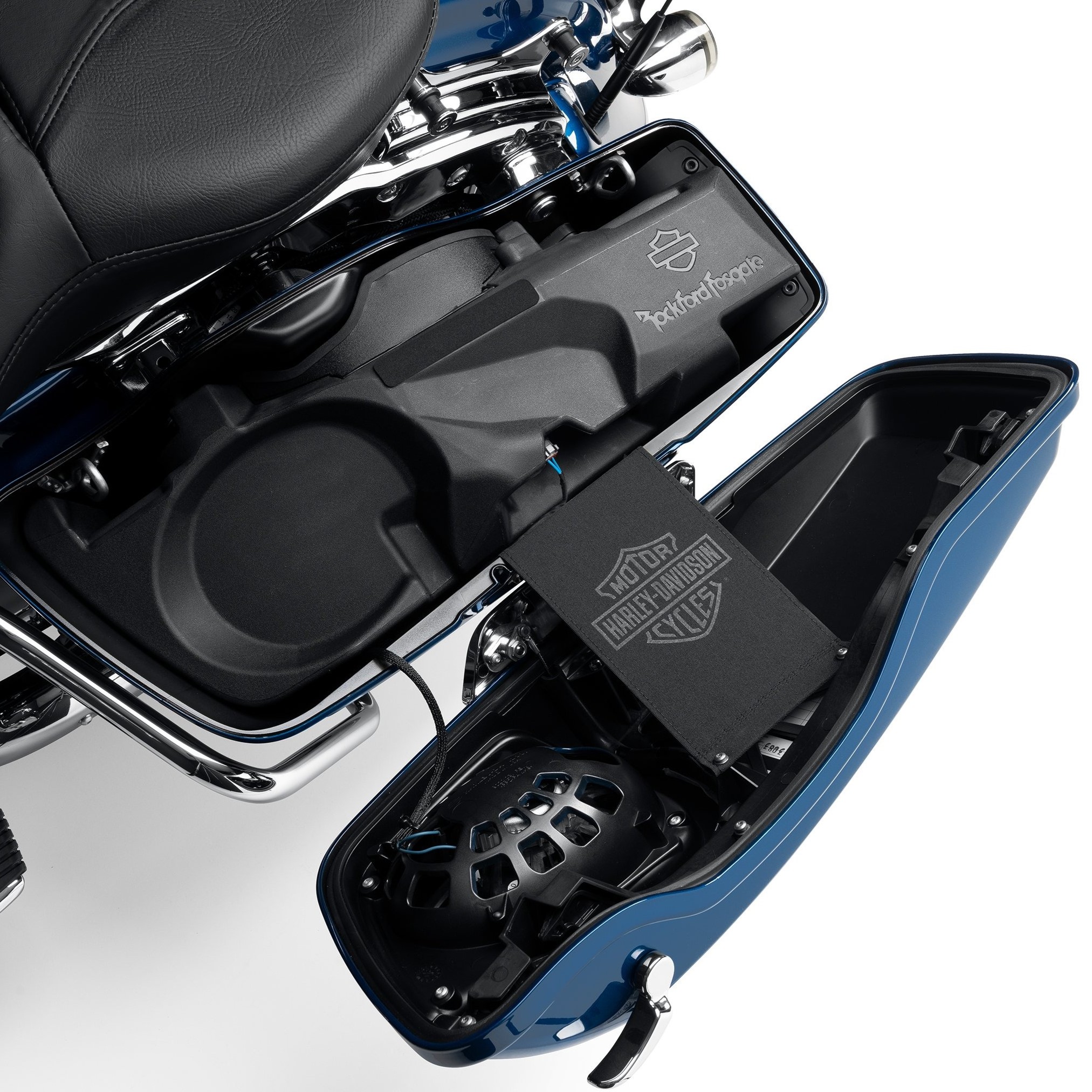 Fits ‘14-later Touring models (except ’23-later FLHFB, FLHXSE, FLTRXSE, ’24-later FLHX, FLTRX and FLTRXSTSE) in the right-side saddlebag when equipped with two or four total speakers on a Harley-Davidson Audio powered by Rockford Fosgate audio system