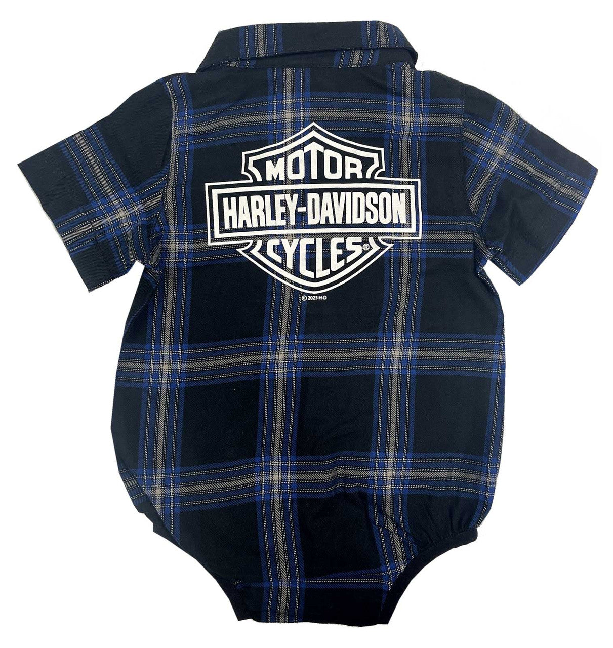 Harley-Davidson® Baby Boys’ Brushed Infant Plaid Shirt Creeper – Black/Blue