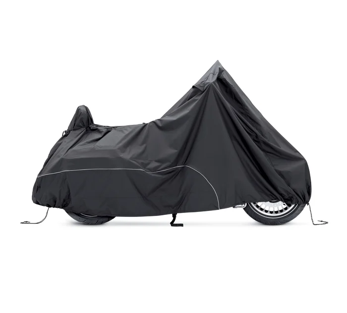 • Cover skirt features front and rear adjustable drawstrings to cinch the cover around the bike, and a convenient belly strap to reduce ballooning in the wind