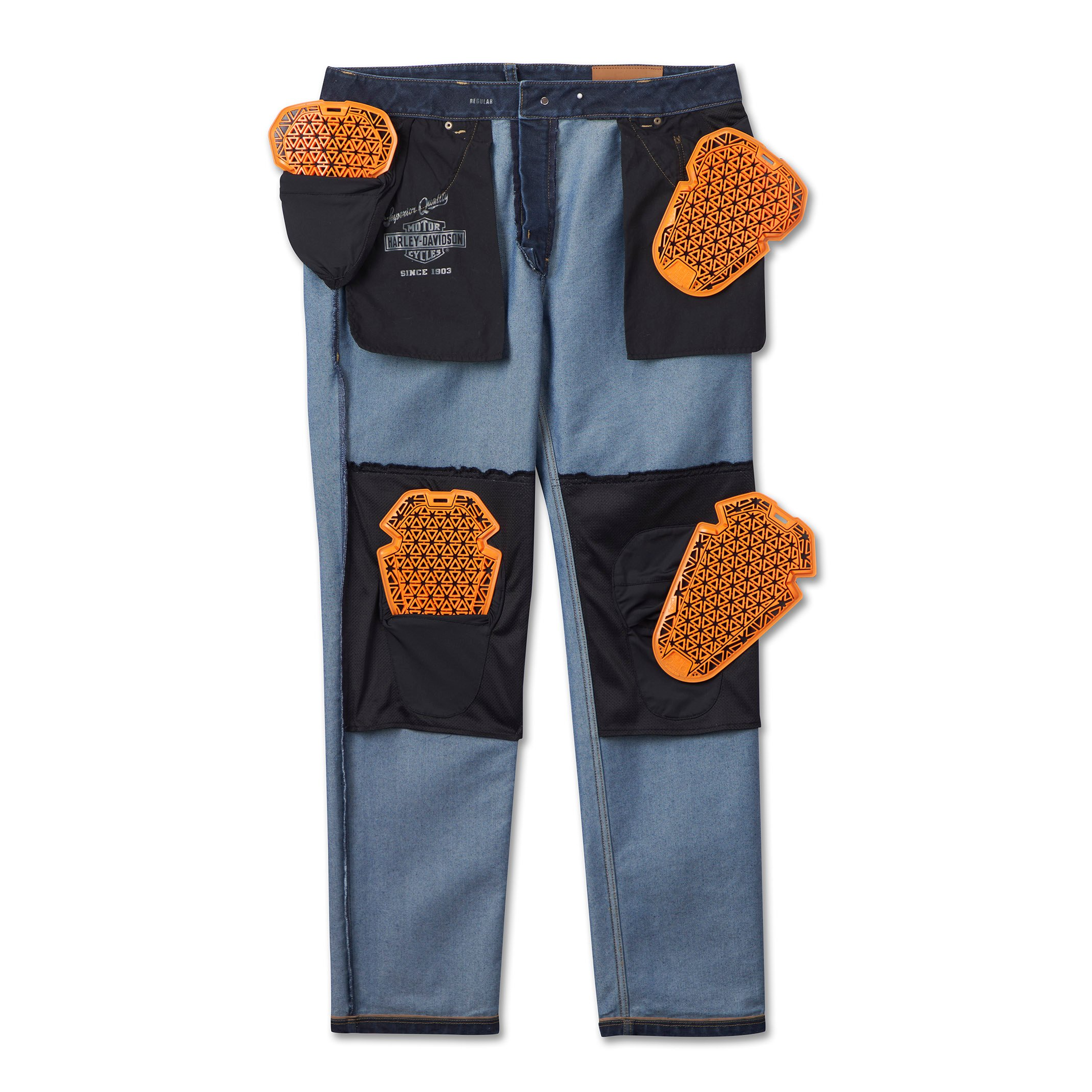 Classic denim style meets impact protection in our latest riding pants. Made abrasion-resistant from a heavyweight material blend, our Harley-Davidson Straight Riding Denim delivers a slimmer fit through the hip and thigh with traditional five-pocket jean styling.
