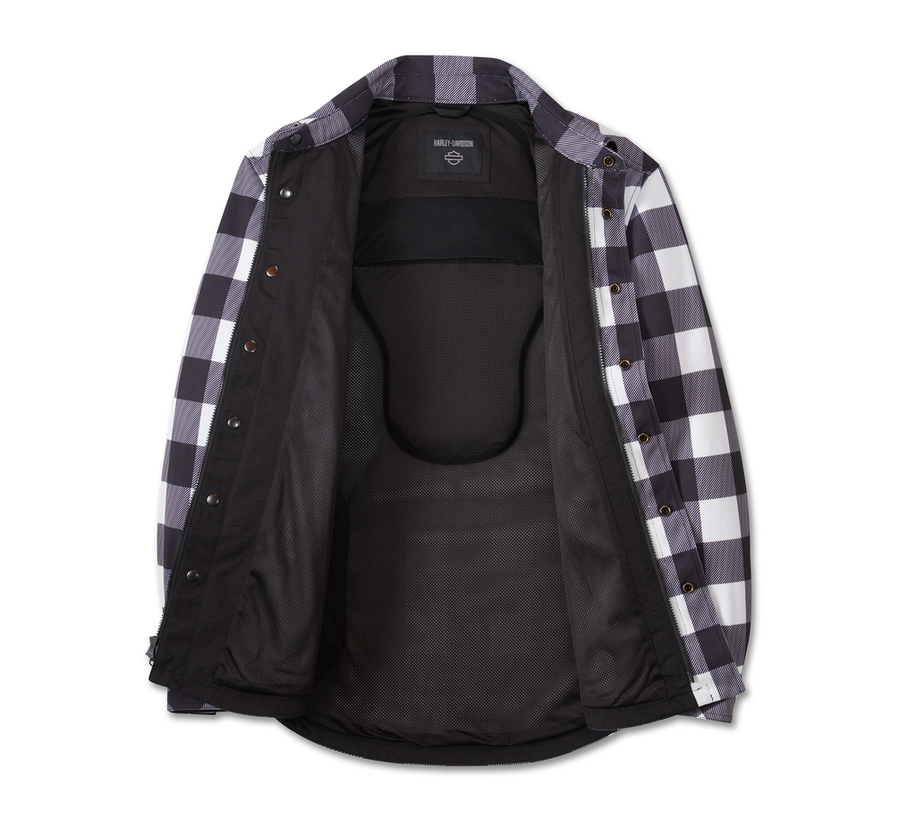 Everything riders love about our previous Operative Riding Jacket is now cooler (literally) in this Limited Edition. That’s because our Operative Mesh Riding Shirt Jacket is now made from heavyweight mesh with a mesh lining to welcome more airflow as you ride (hover over to see). This men’s motorcycle shirt jacket also includes superior impact protection with our D3O Ghost armor at the shoulders and elbows. Other ride-enhancing features include reflective material to boost visibility and a hidden snap-down collar that stays put during rides. Its box plaid pattern is the perfect backdrop for our reflective branding on back. School yourself on all the specs below, then order now while supplies last…