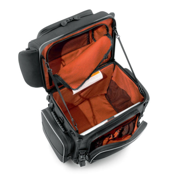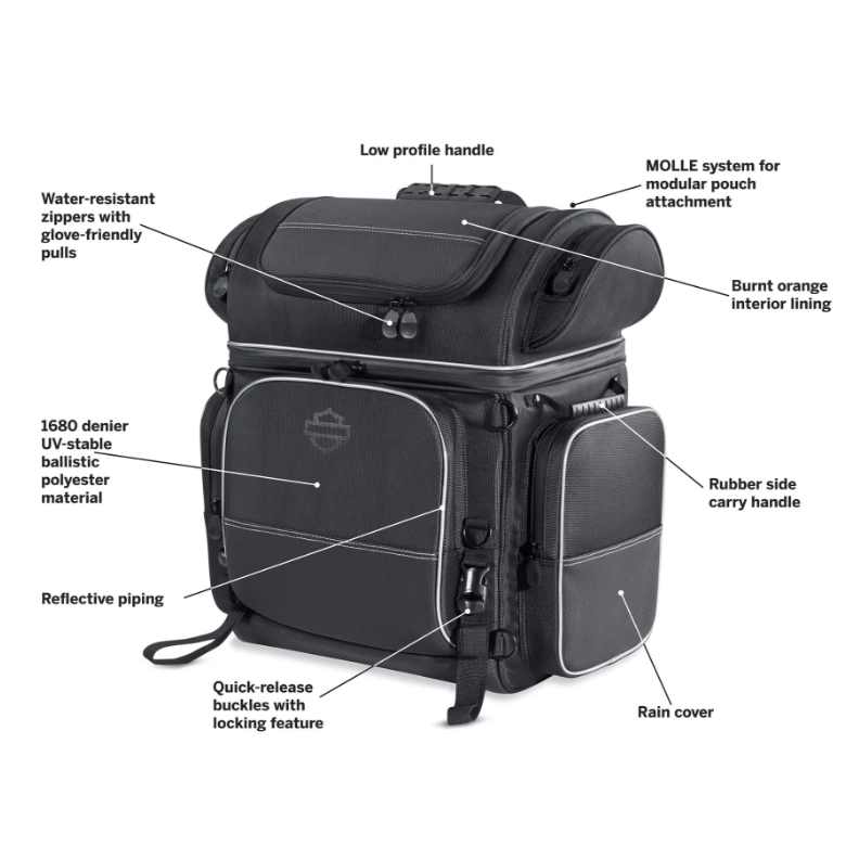 Designed by riders for riders, the Onyx Premium Luggage Collection is the best luggage Harley-Davidson has to offer and, provides everything you need in motorcycle luggage and nothing you don’t. The Onyx Collection Touring Bag is perfect for long haul trips. This bag features a separate top compartment to keep your shoes separate from your clothes, a main compartment that can store enough jeans and t-shirts for a two week trip and the main compartment lid features removeable lid straps that keep the top compartment from falling forward or back when loading the main compartment. The large front pocket holds keys, pens, documents and small electronics. The two outer pockets at the top of the bag are perfect for eyewear storage, while the two, large lower exterior pockets are perfect for storing rain gear.