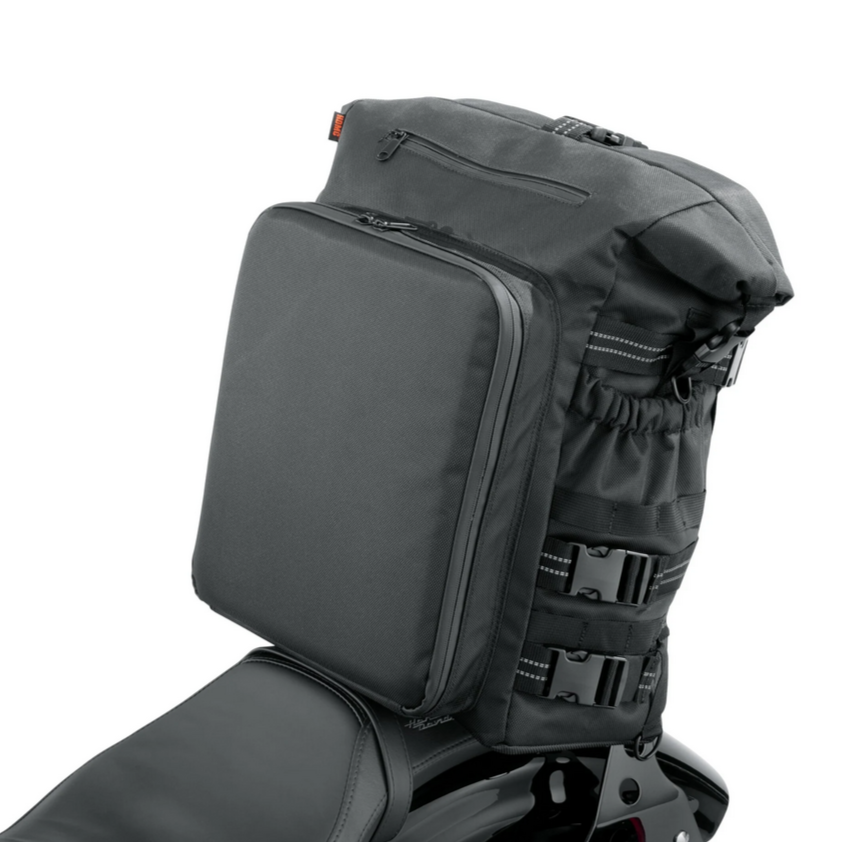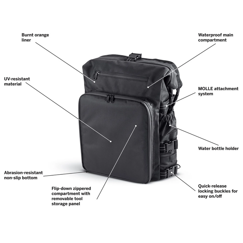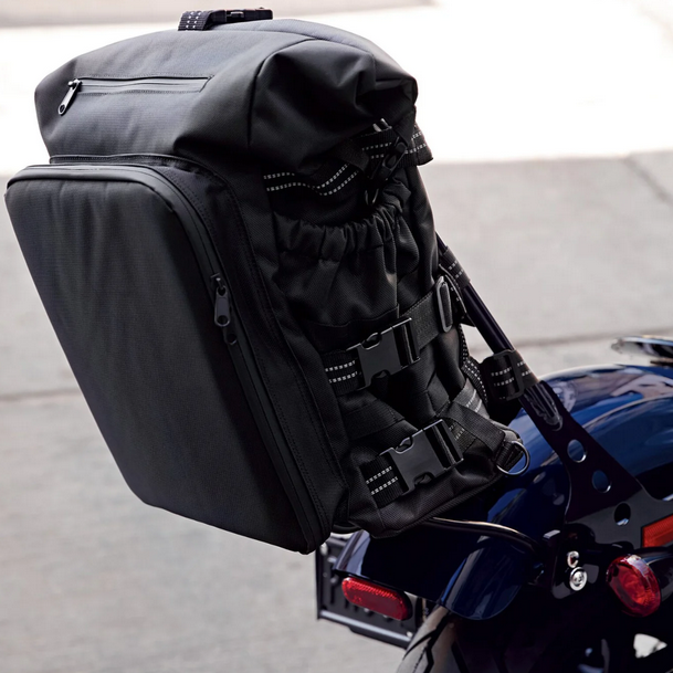 The Overwatch Large Sissy Bar Bag features a cavernous main compartment large enough to accommodate enough clothes for a long weekend trip. Sunglasses and other small items fit conveniently in the small front pocket while the draw-bridge style outer pocket features two removable tool pouches (tools not included) which can also be used to organize cords and key. An elasticized side pouch fits a large water bottle.
