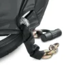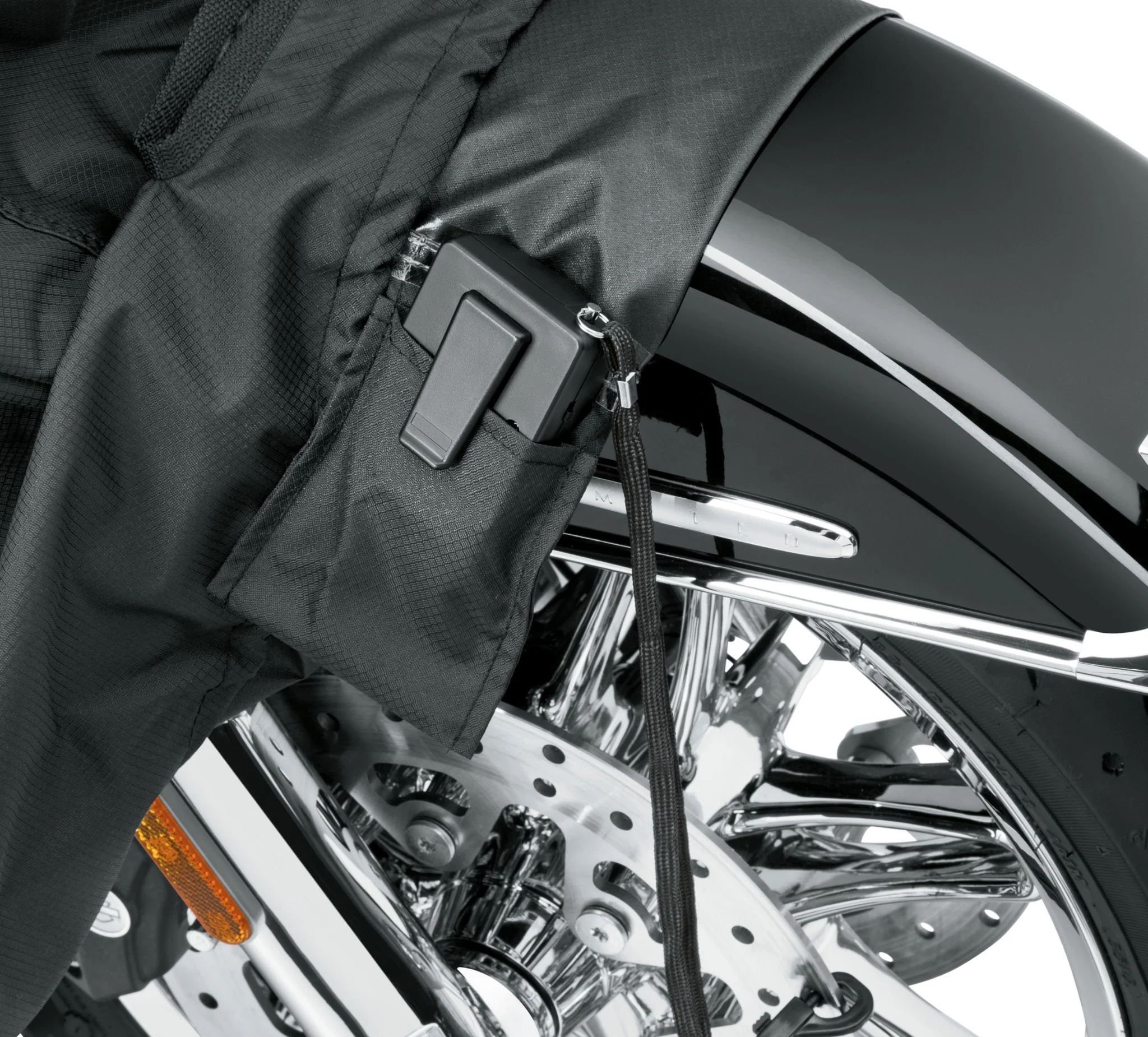 The skirt features front and rear adjustable drawstrings to cinch the cover around the bike, and a convenient belly strap to reduce ballooning in the wind & features a convenient opening near the front wheel for a security chain or cable. The internal pockets accept an optional Cover Alarm.