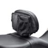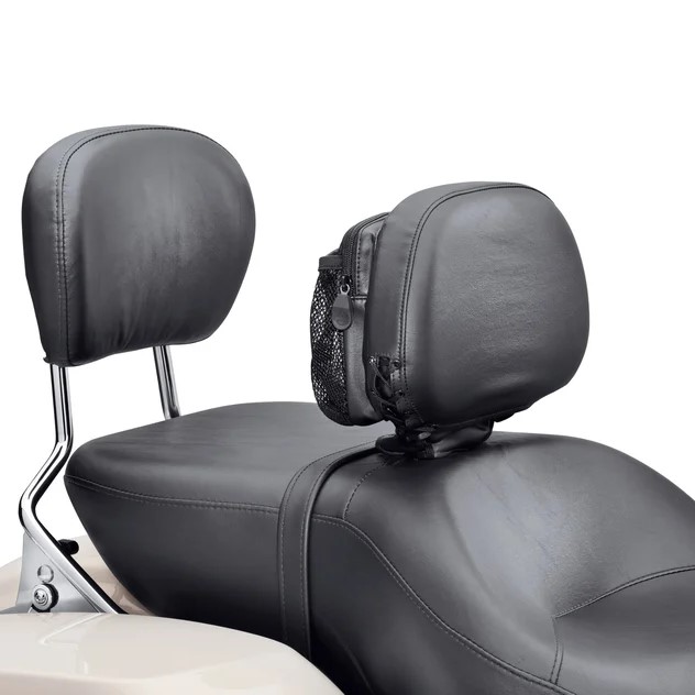 Convenient storage system is form fitted to the rider backrest, and provides easy access to a variety of on-road necessities.