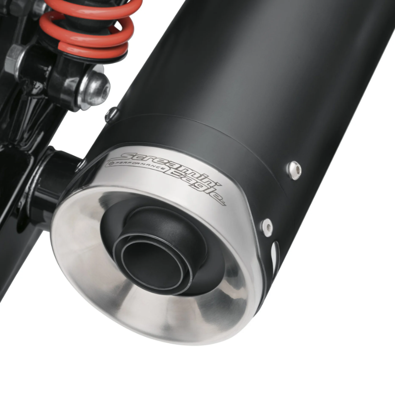 • Contrasting bright stainless end cap is finished with a laser-engraved Screamin’ Eagle logo