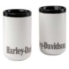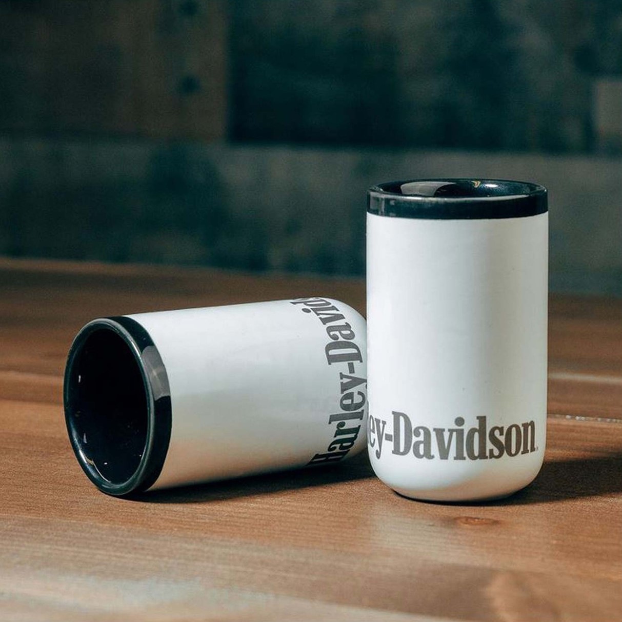 Set of two 90 ml ceramic shooters with white exterior and gloss black interior/rim. Grey Harley-Davidson font along the base.